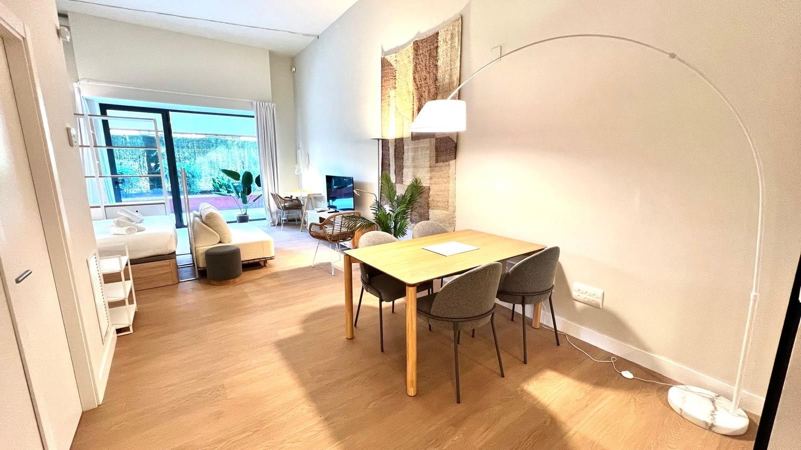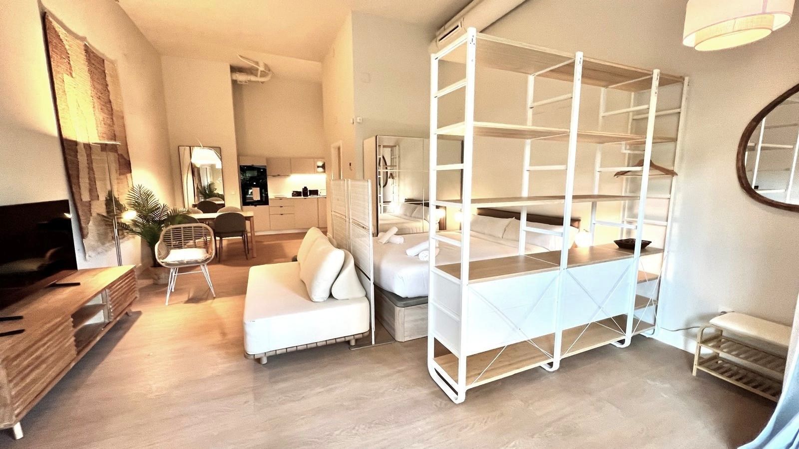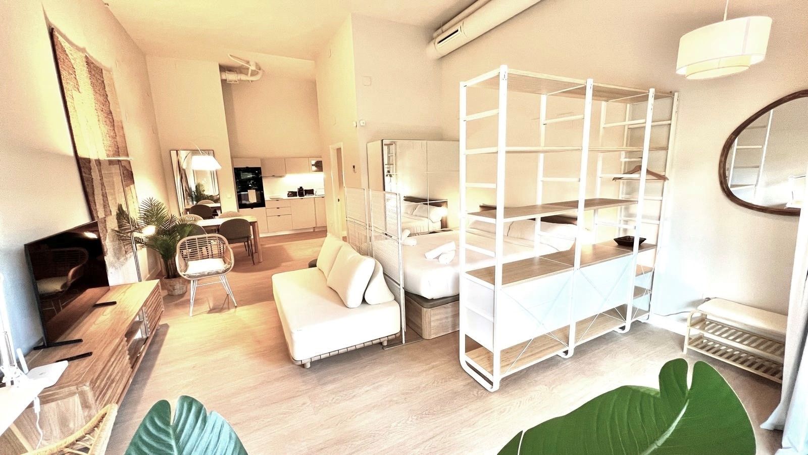 Estudio tipo loft, con altura de techo de 4 metros, amueblado para vivienda alquiler tipo temporal, todo nuevo, calefacción y aire acondicionado por conductos, cocina con electrodomesticos.