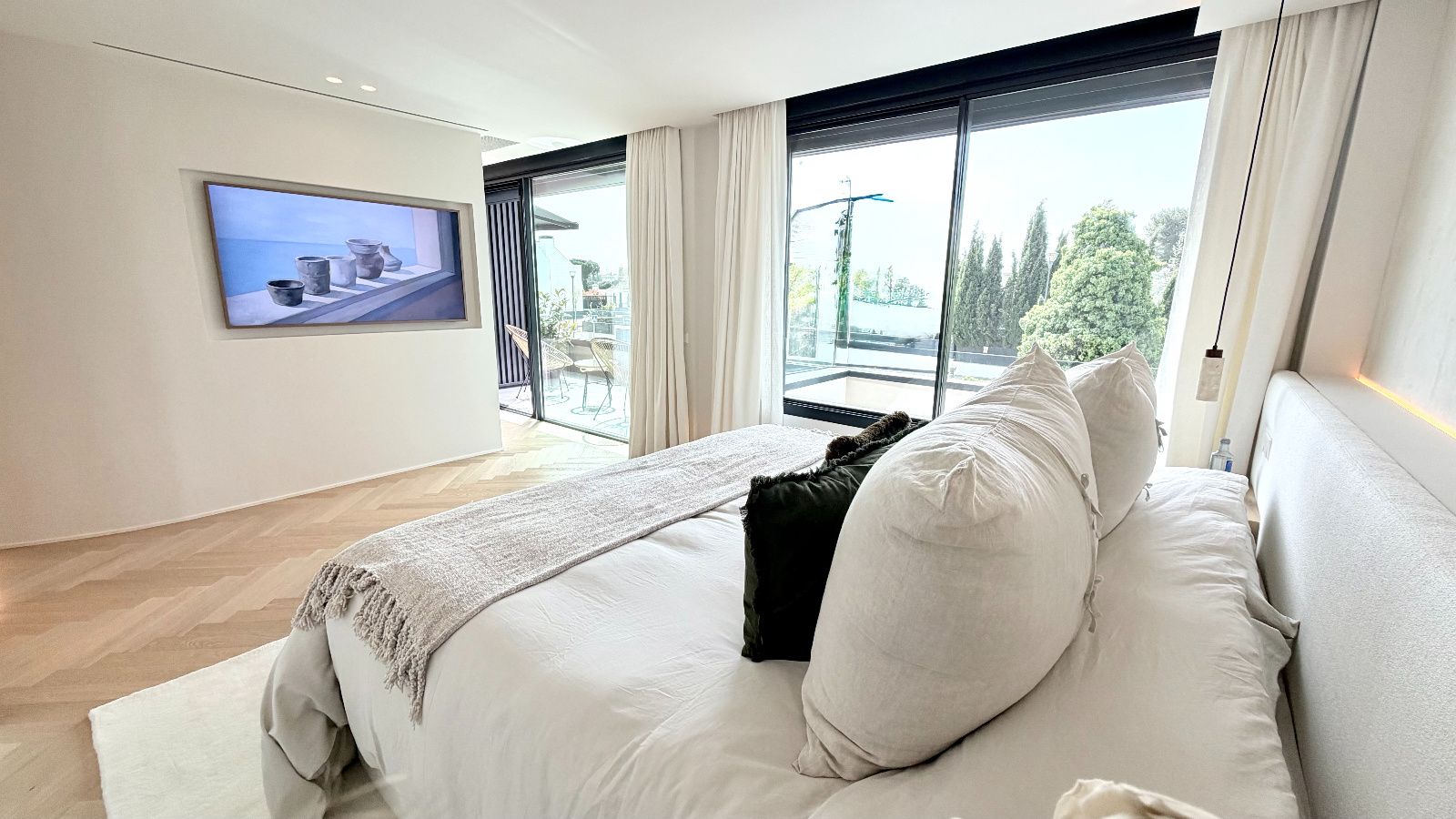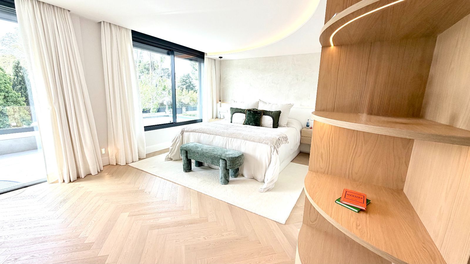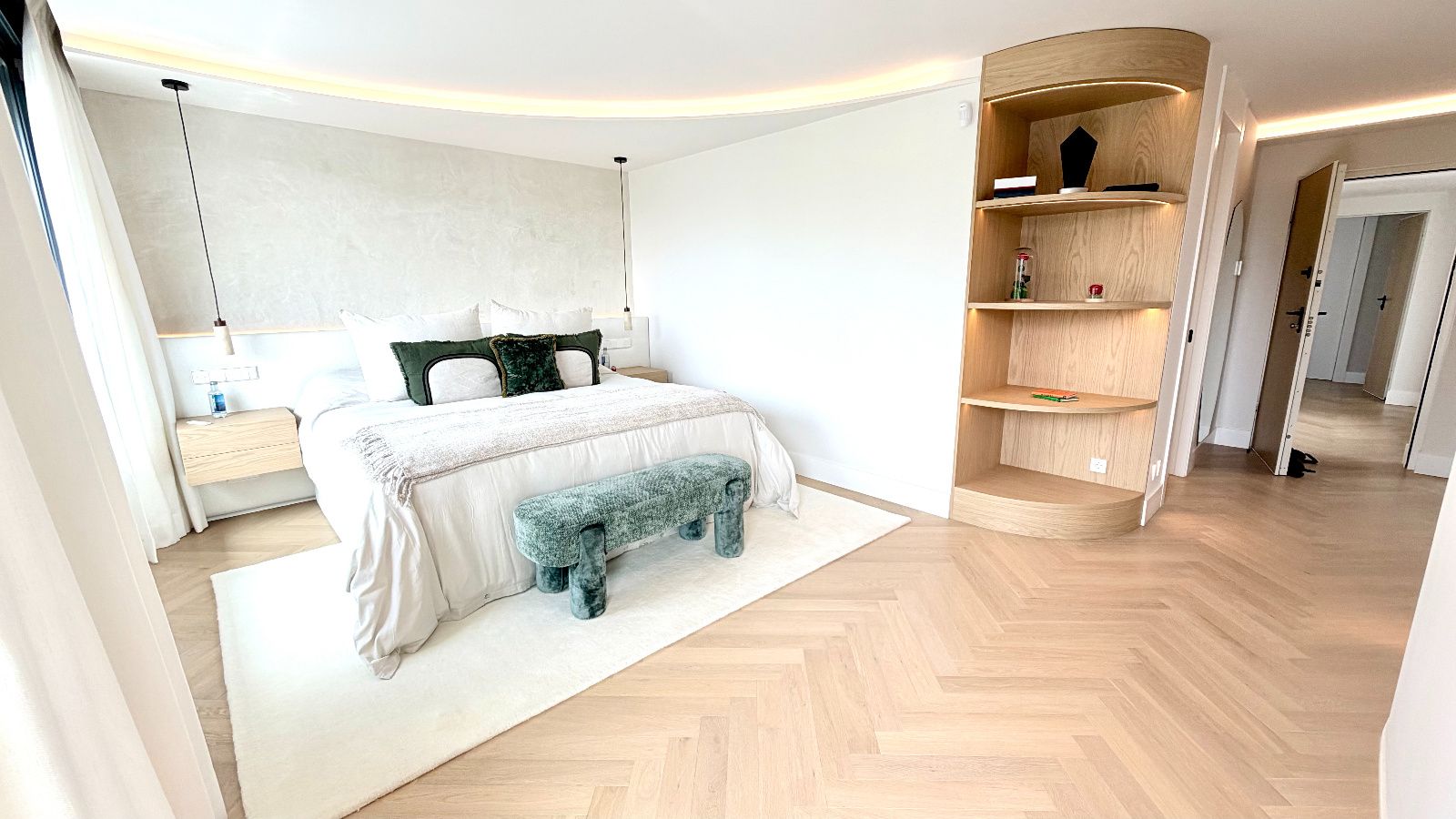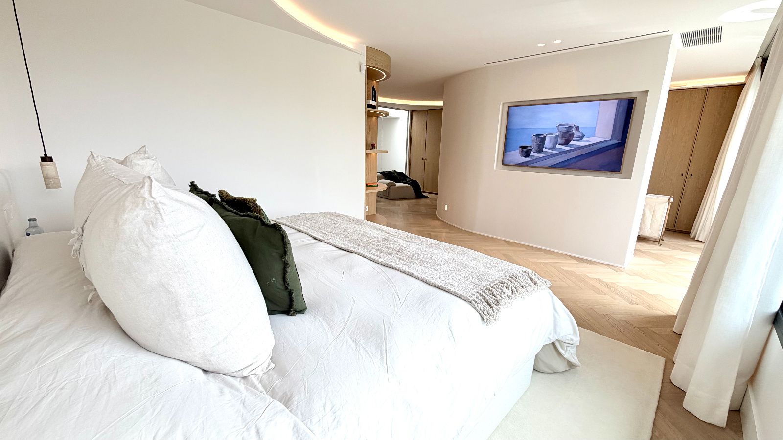 Dormitorio principal tipo suite, resultado de la unión de dos habitaciones con acceso a terraza con vistas despejadas, vestidor de diseño optimizando todos los espacios, baño principal de lujo con ducha de gran formato y bañera independiente de diseño.