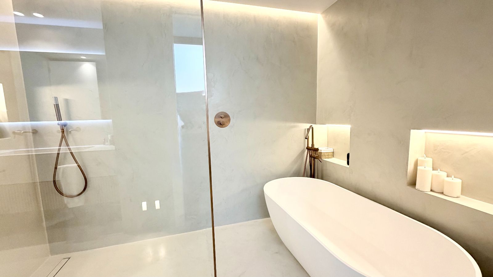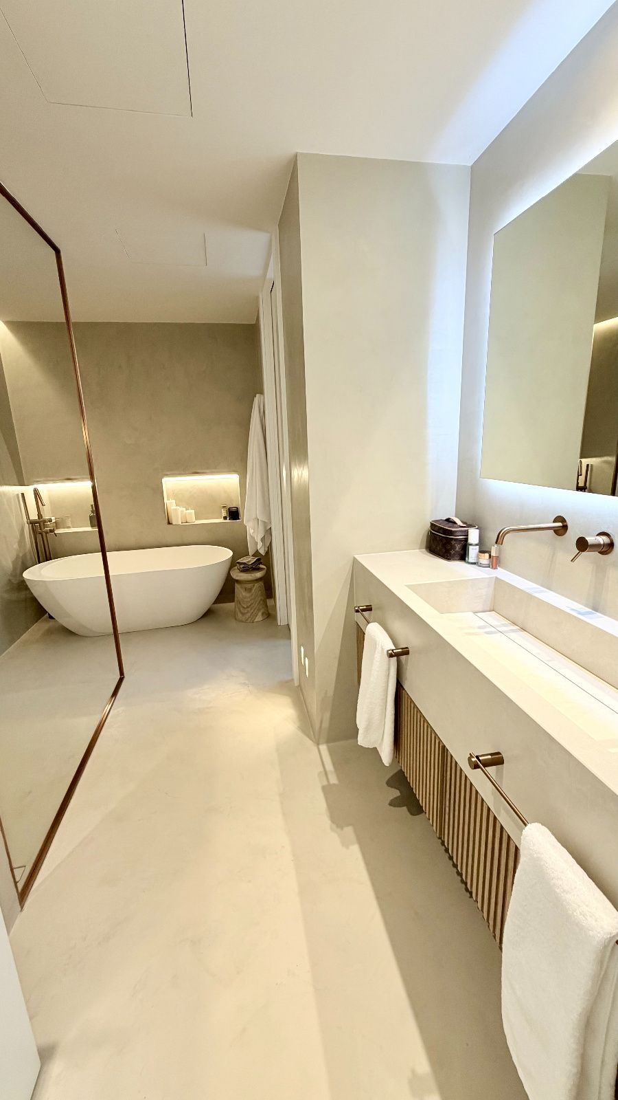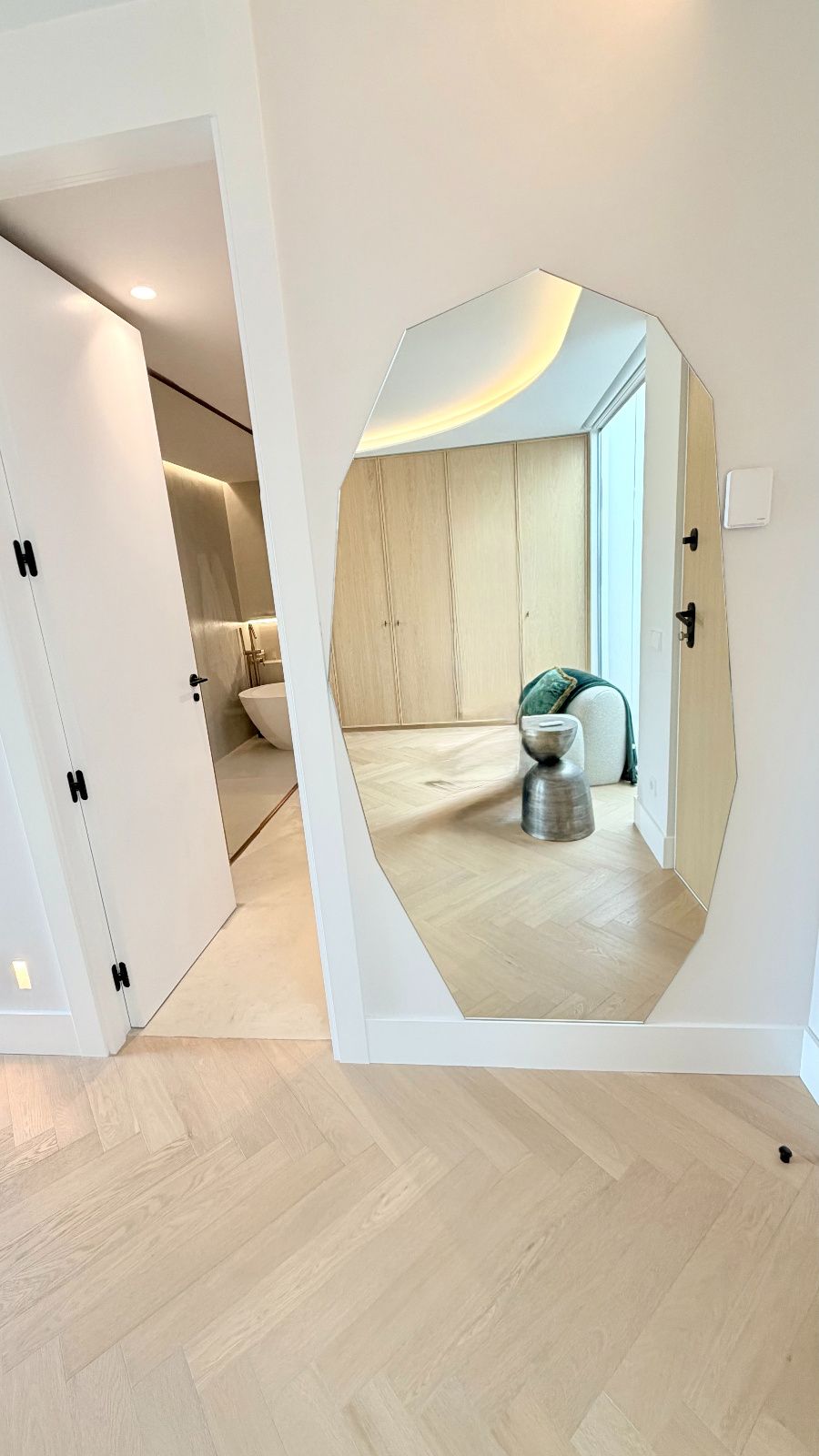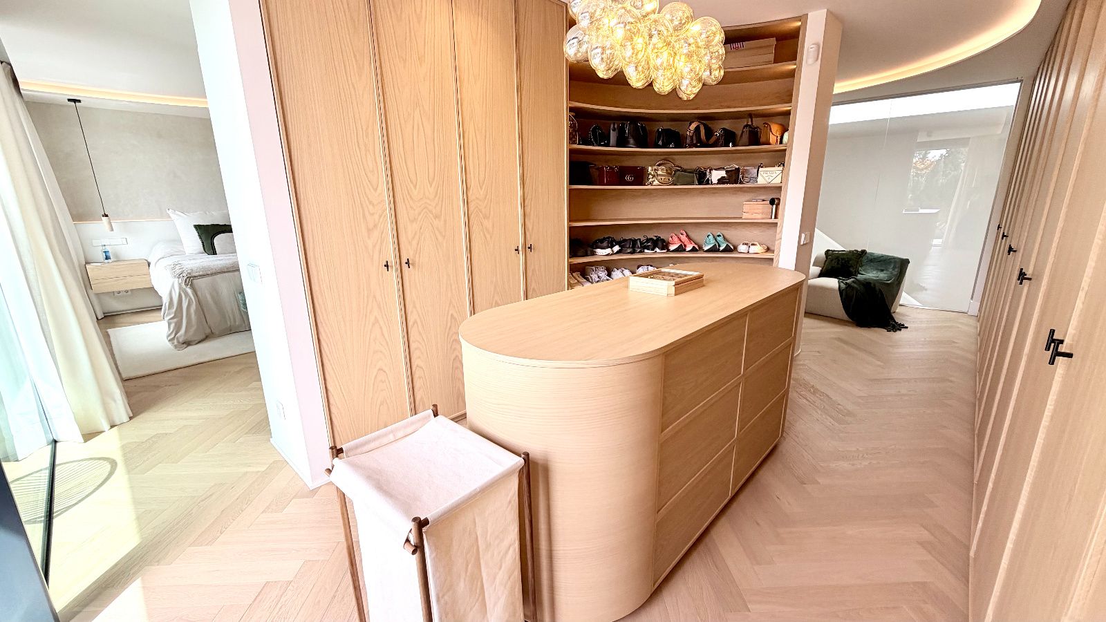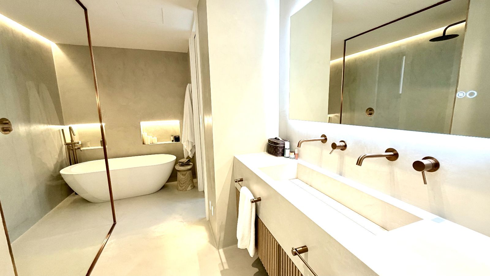 Dormitorio principal tipo suite, resultado de la unión de dos habitaciones con acceso a terraza con vistas despejadas, vestidor de diseño optimizando todos los espacios, baño principal de lujo con ducha de gran formato y bañera independiente de diseño.