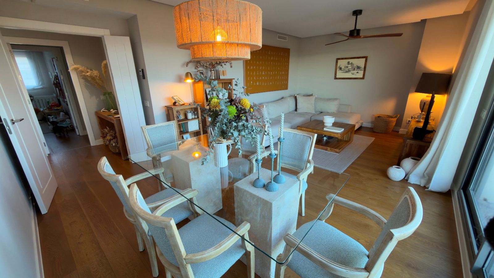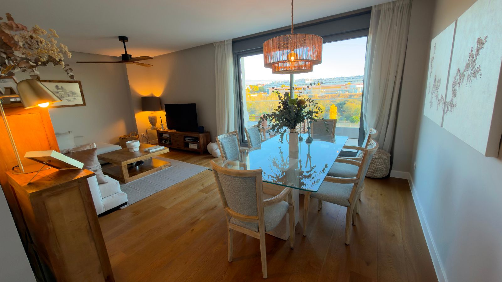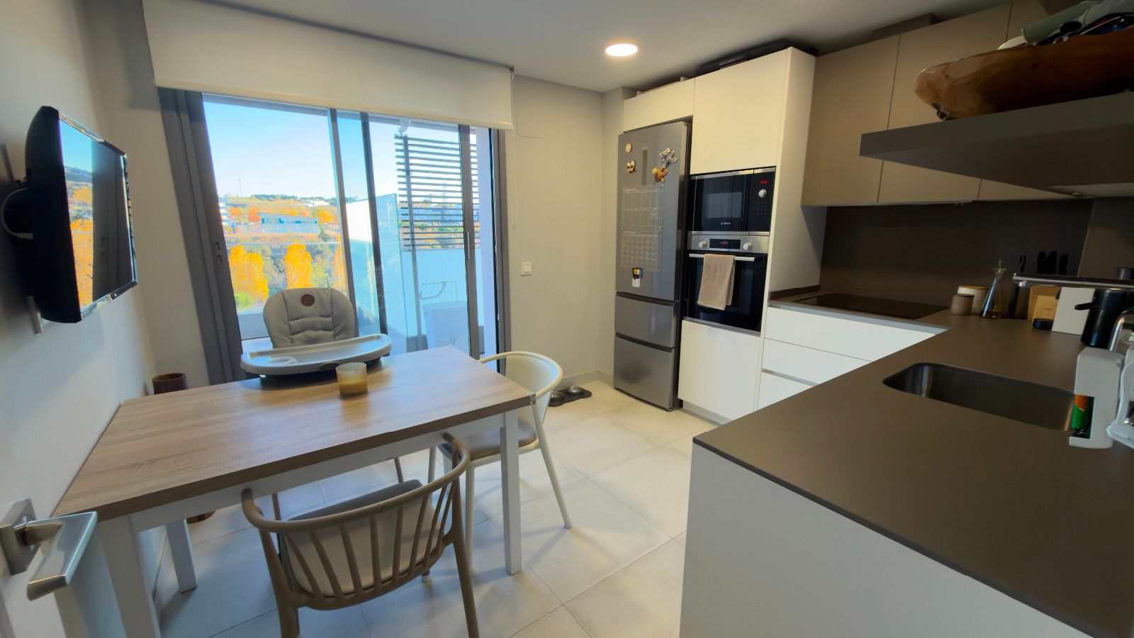 Al acceder a la vivienda, un amplio hall de entrada nos da la bienvenida y nos conduce a una cocina independiente, espaciosa y funcional, con acceso directo a la zona de lavandería. A continuación, se abre un luminoso salón-comedor con grandes ventanales de suelo a techo, que inundan el espacio de luz natural y ofrecen salida directa a una acogedora terraza.