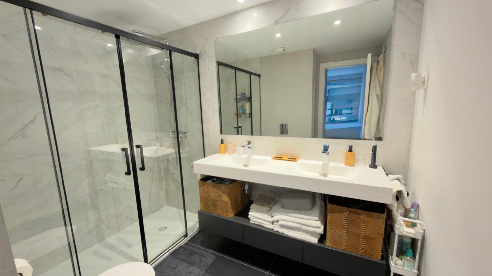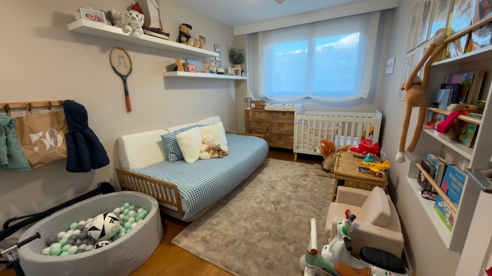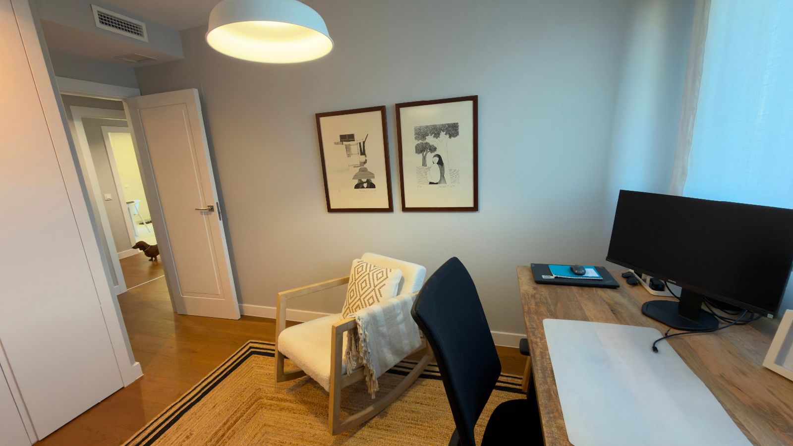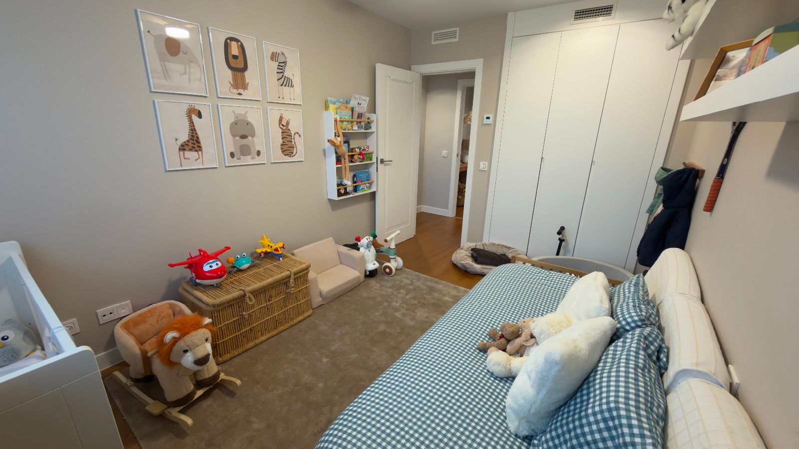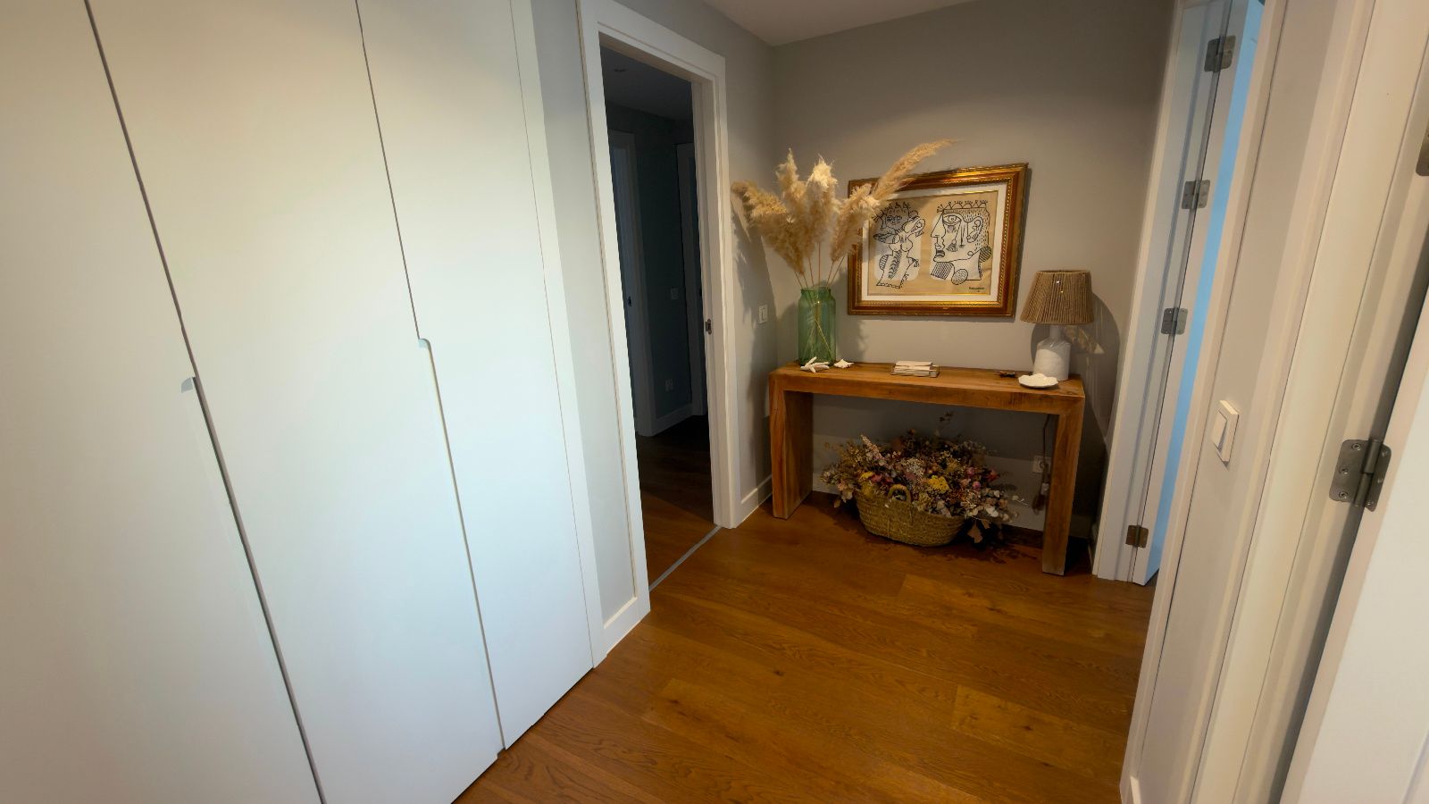 La zona de descanso se encuentra perfectamente separada del área social, lo que garantiza privacidad y confort. La vivienda dispone de tres dormitorios: dos de ellos comparten un baño completo con bañera, mientras que el dormitorio principal se configura como una elegante master suite con baño en suite y vestidor. Además, la vivienda disfruta de ventilación cruzada y doble orientación, lo que favorece una climatización natural y eficiente.