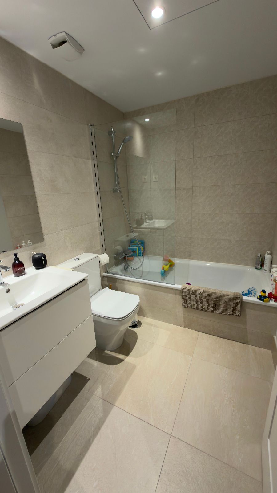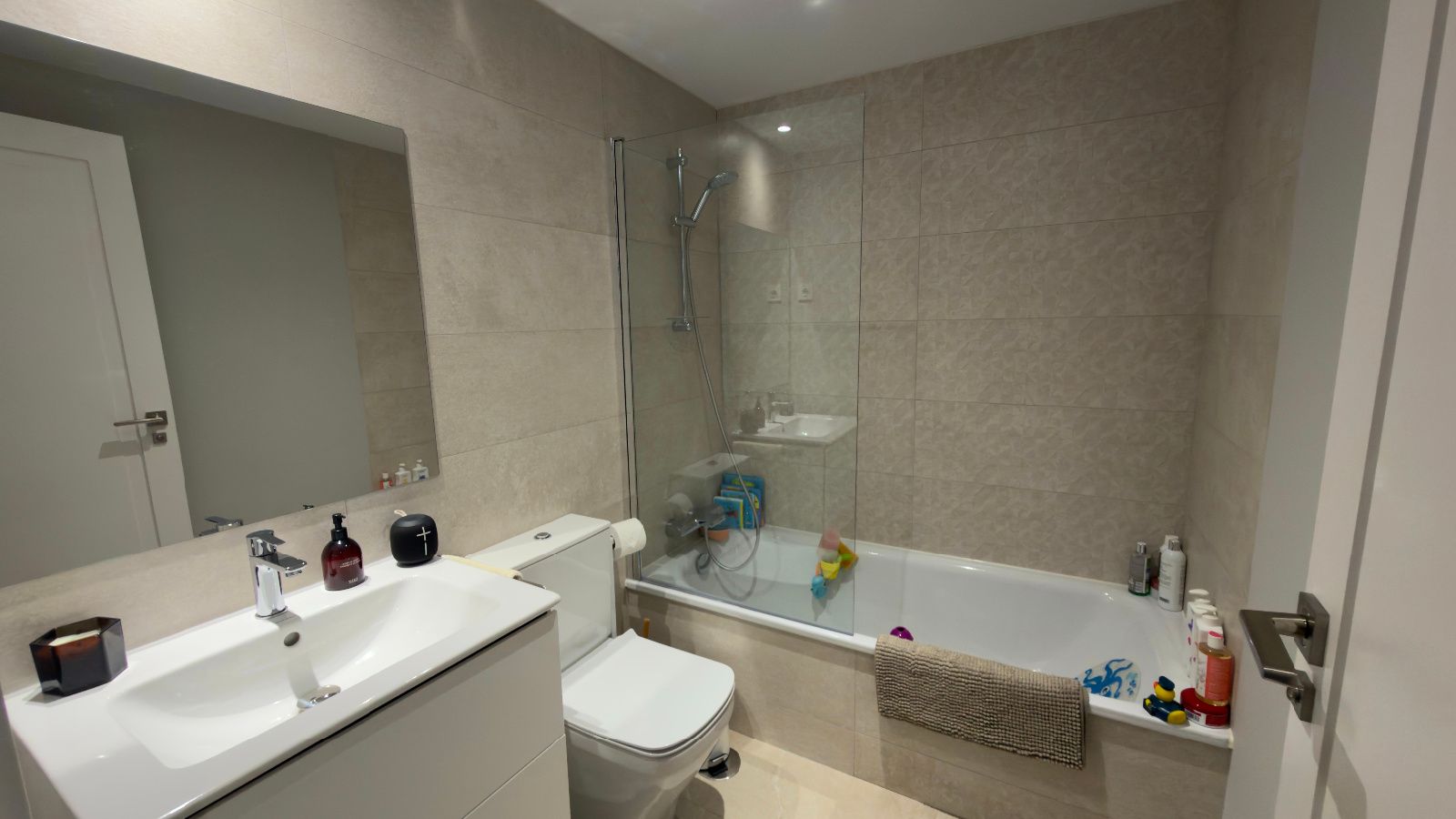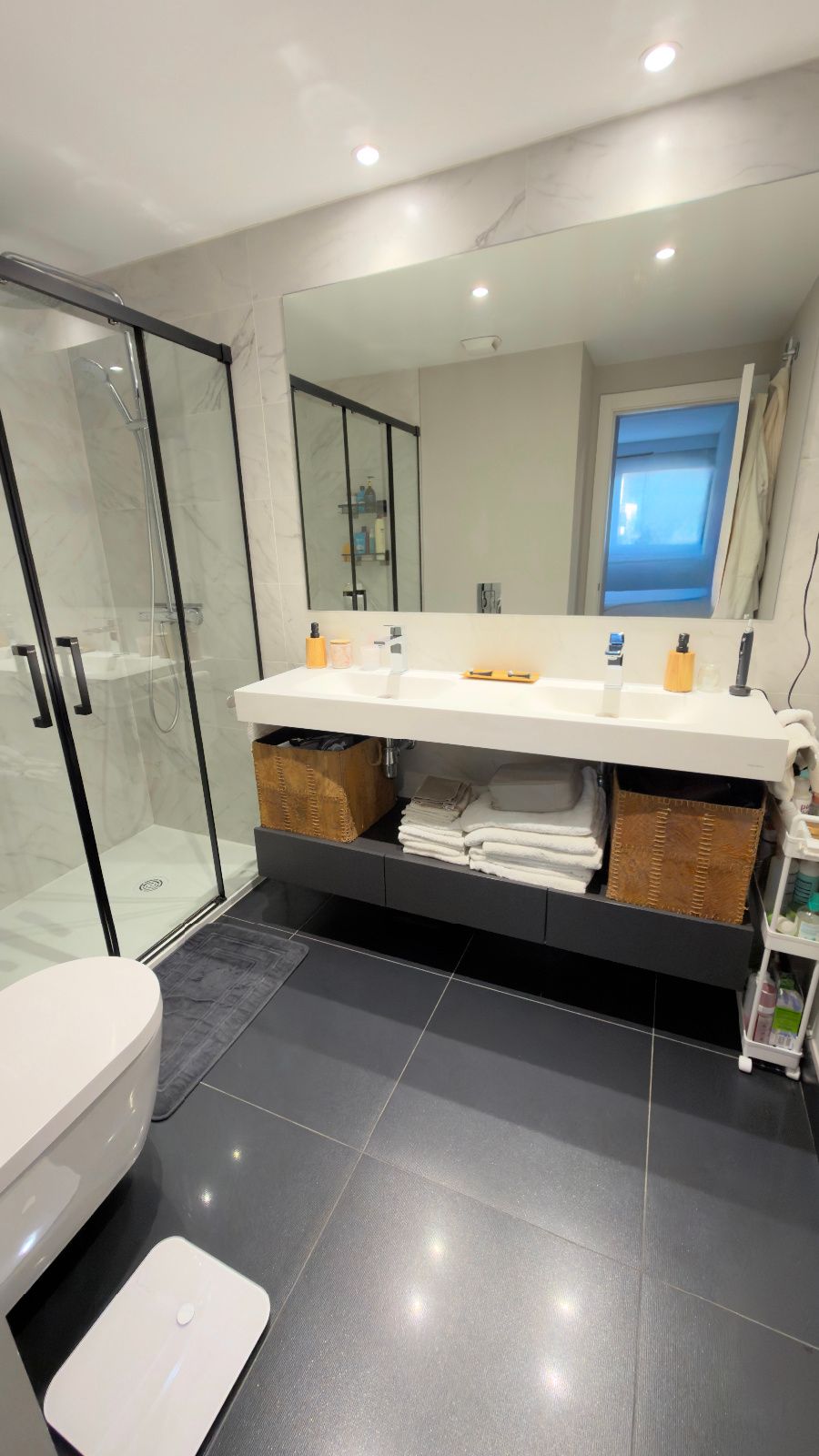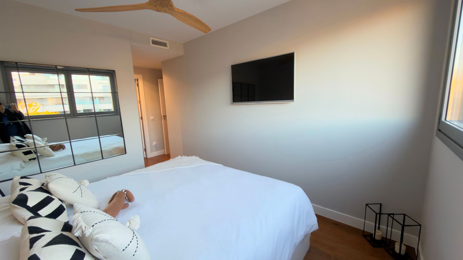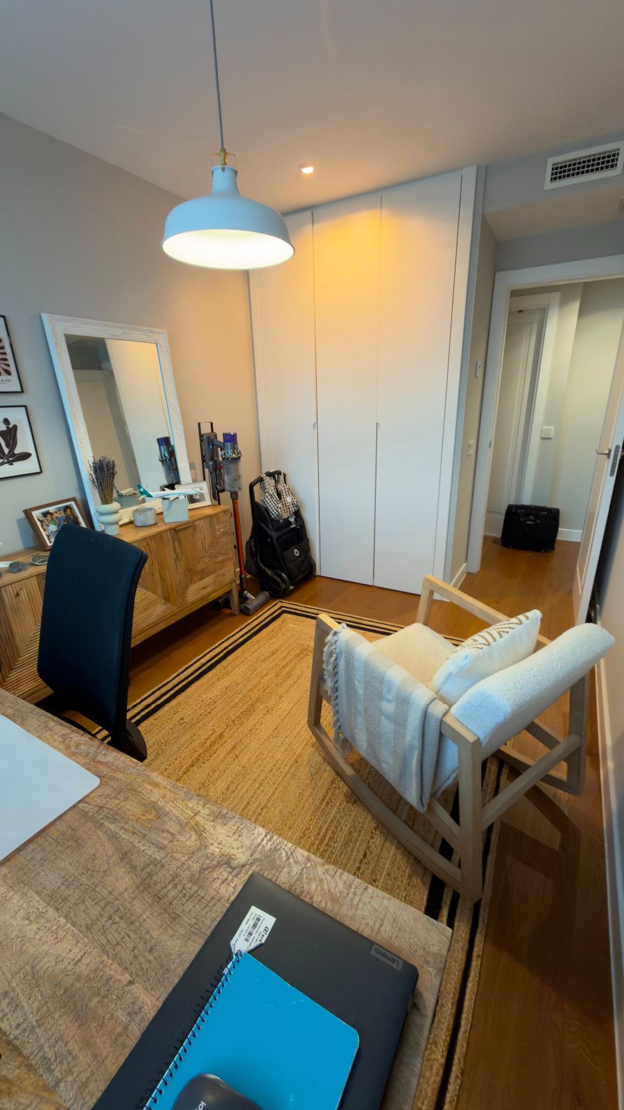 La zona de descanso se encuentra perfectamente separada del área social, lo que garantiza privacidad y confort. La vivienda dispone de tres dormitorios: dos de ellos comparten un baño completo con bañera, mientras que el dormitorio principal se configura como una elegante master suite con baño en suite y vestidor. Además, la vivienda disfruta de ventilación cruzada y doble orientación, lo que favorece una climatización natural y eficiente.