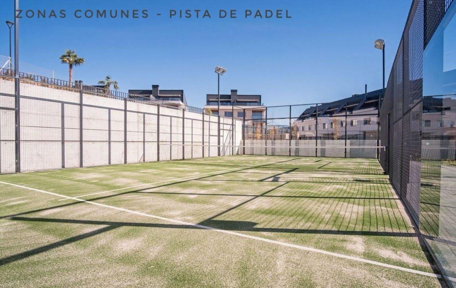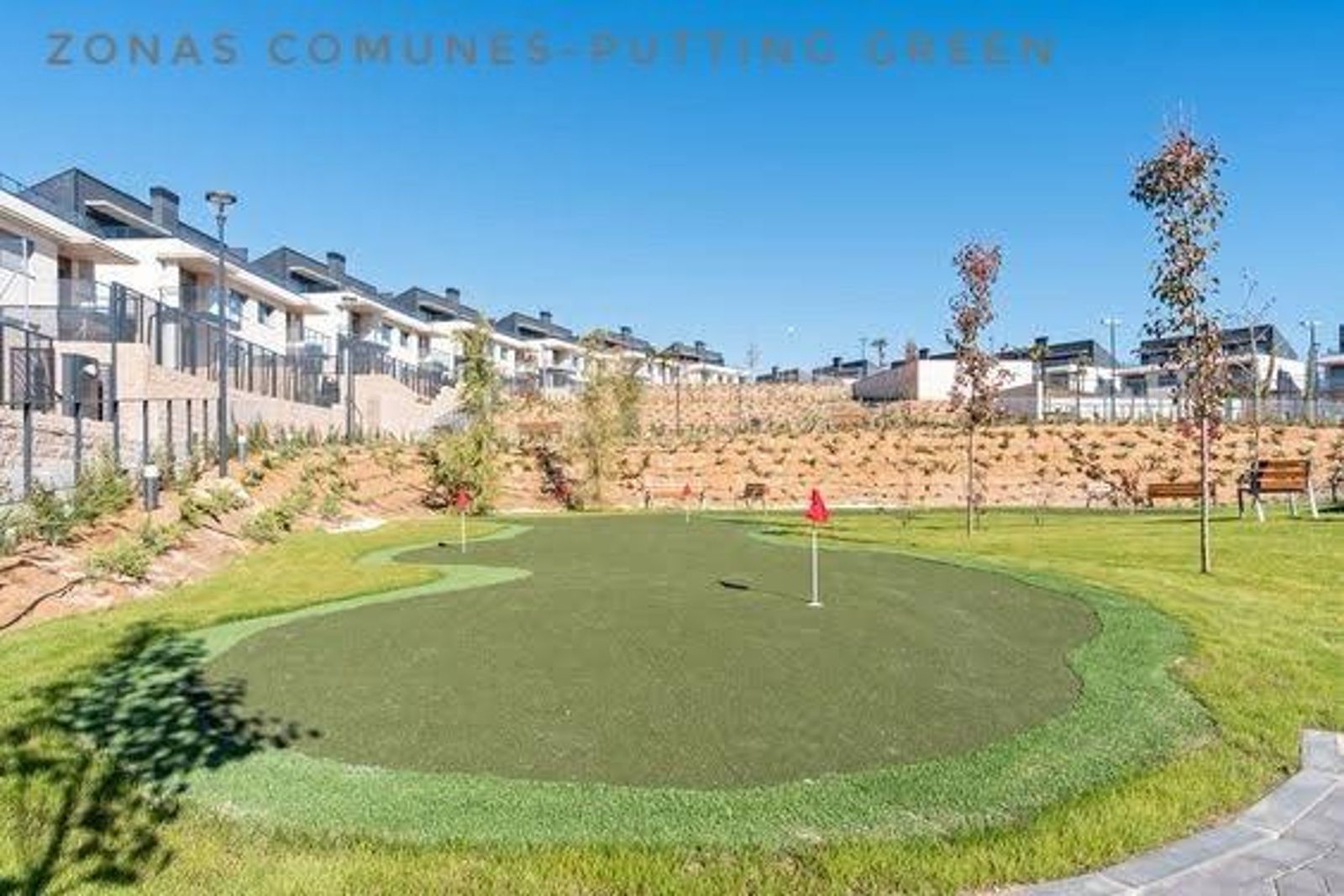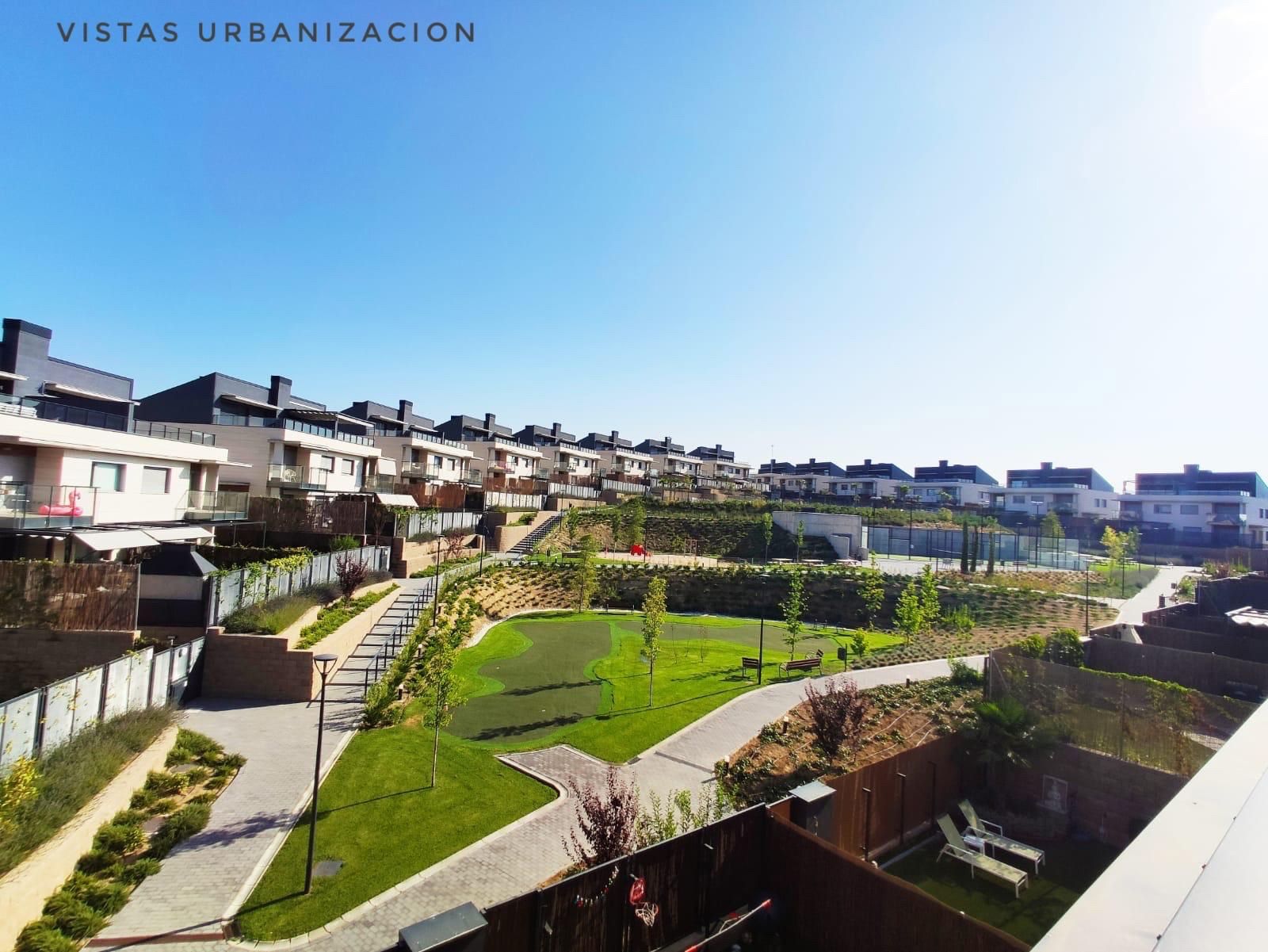 Urbanización exclusiva de chalets con amplias zonas comunes: putting green, pádel, vesturarios, área infantil, zona de picnic, jardines y dos piscinas de cloración salina, una de ellas para niños. Acceso cerrado a la urbanización.