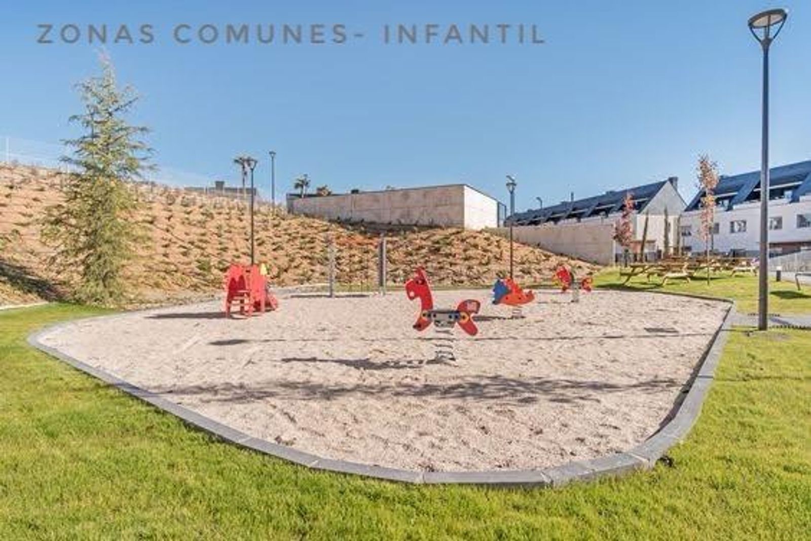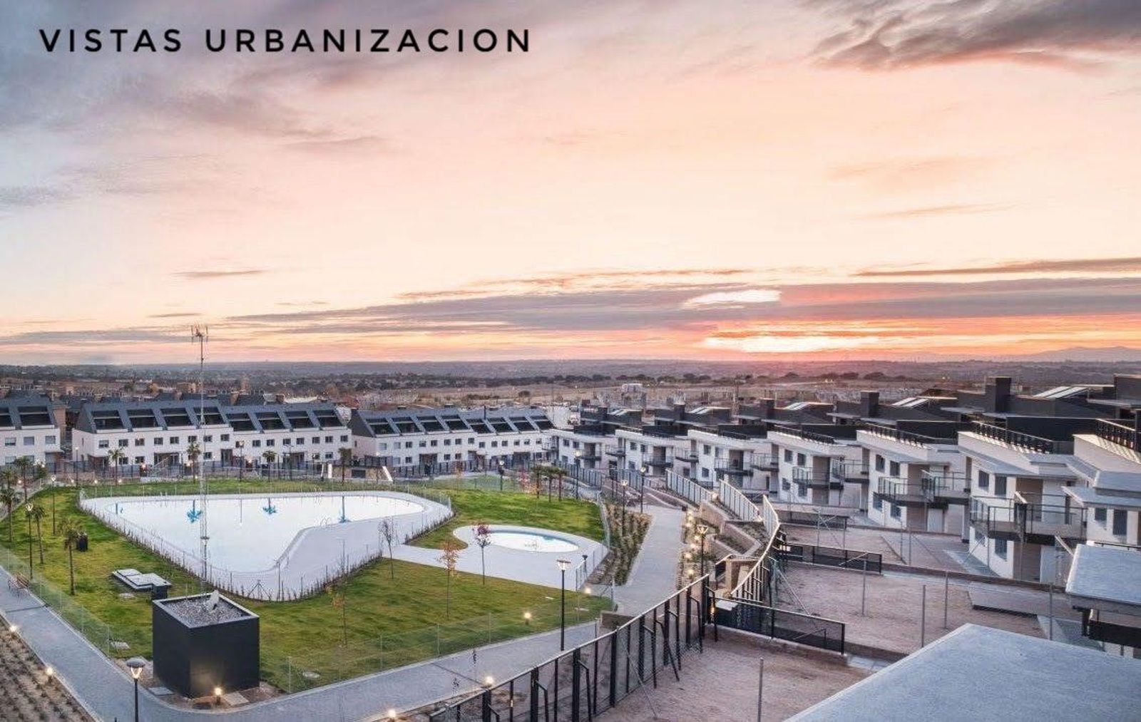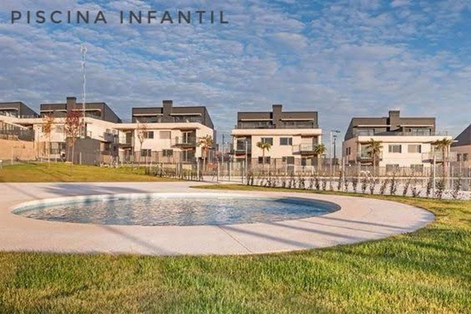 Urbanización exclusiva de chalets con amplias zonas comunes: putting green, pádel, vesturarios, área infantil, zona de picnic, jardines y dos piscinas de cloración salina, una de ellas para niños. Acceso cerrado a la urbanización.