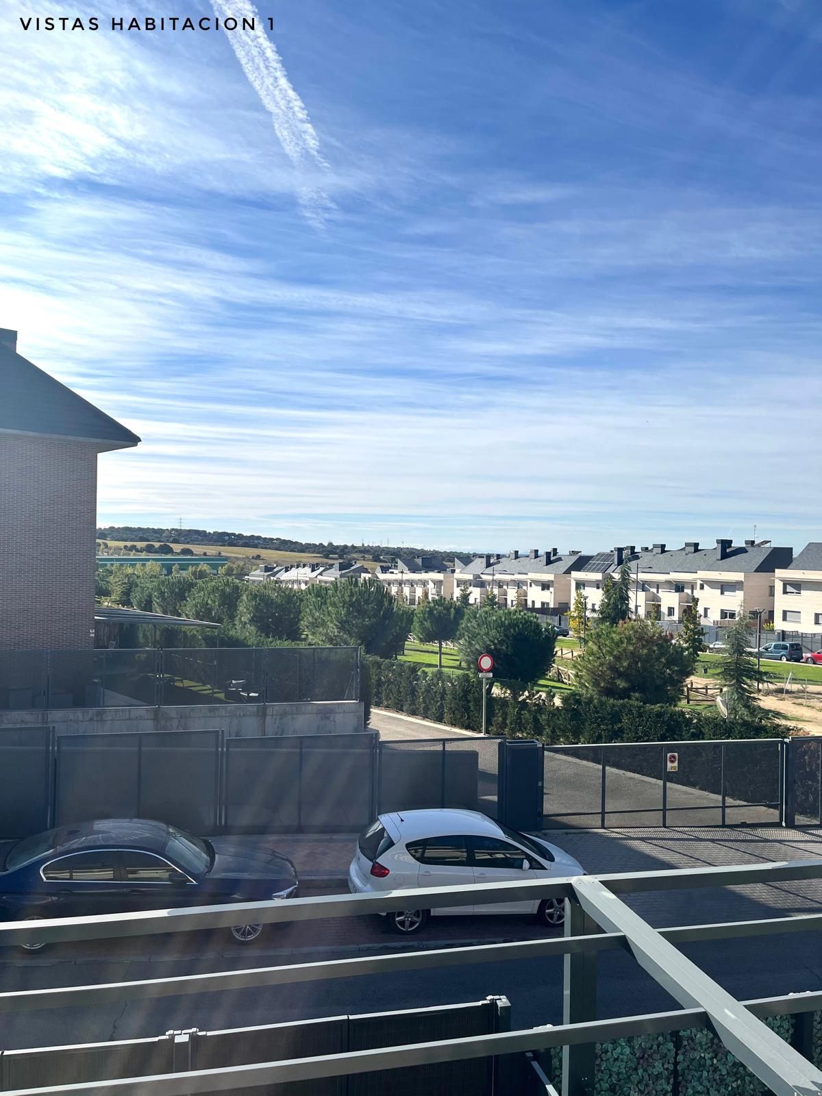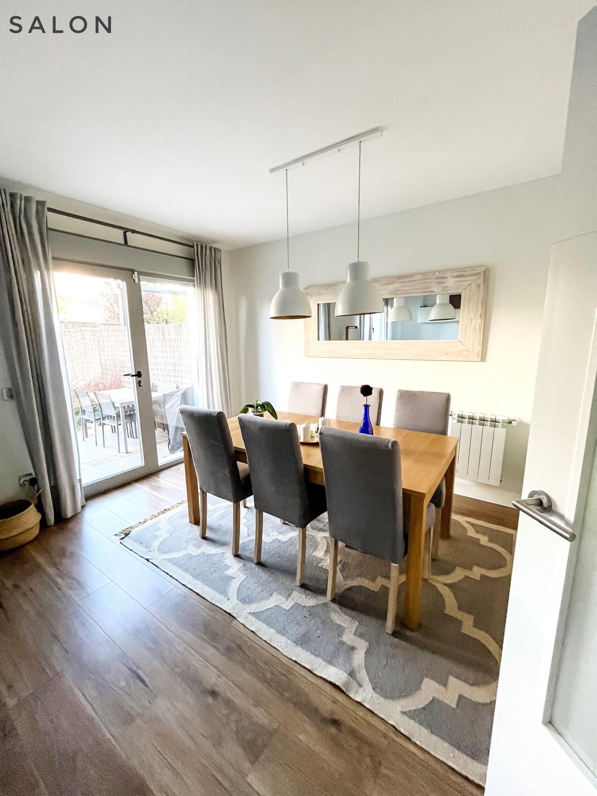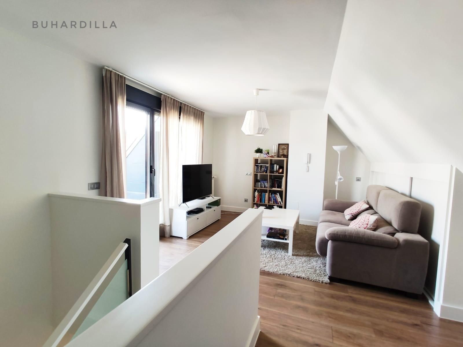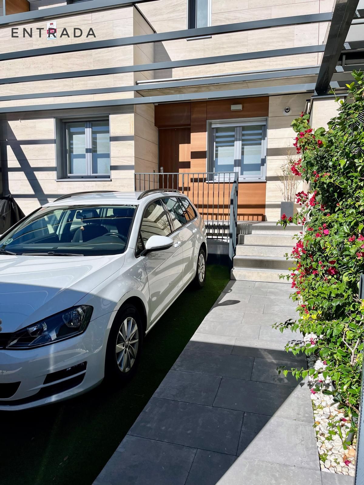 Chalet adosado de tres plantas, 4 dormitorios, 3 baños, salón-comedor, cocina, buhardilla, terraza solárium, garaje para dos coches y jardín privativo.
