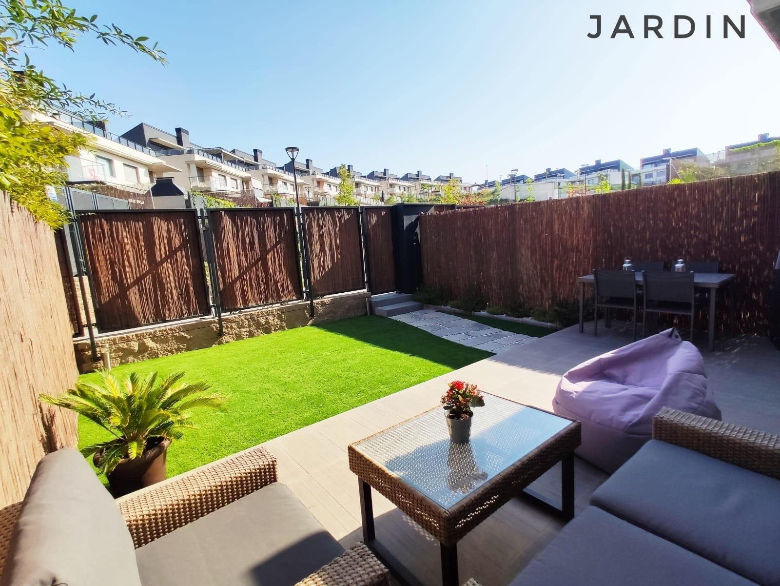 El jardín con zona solada y césped, con salida directa a las zonas comunes.