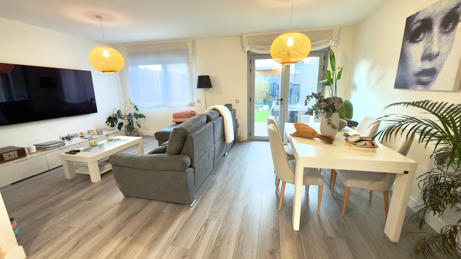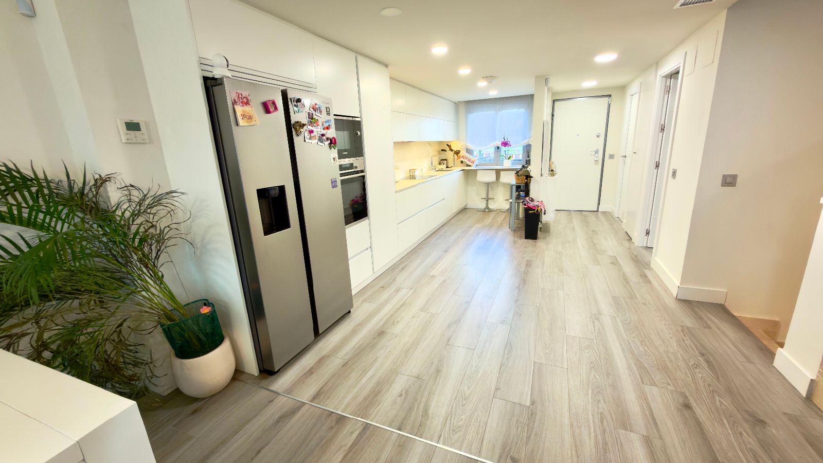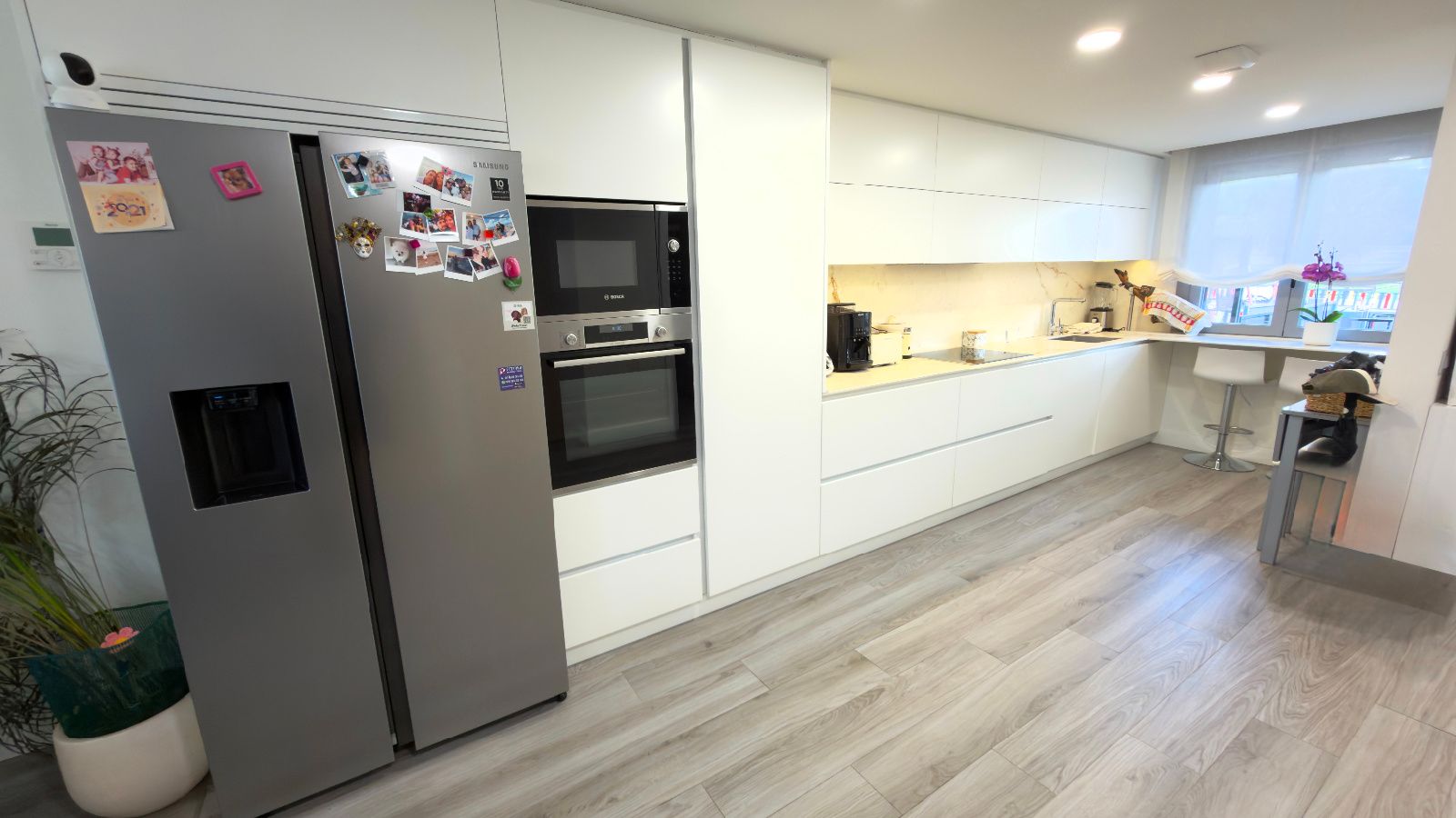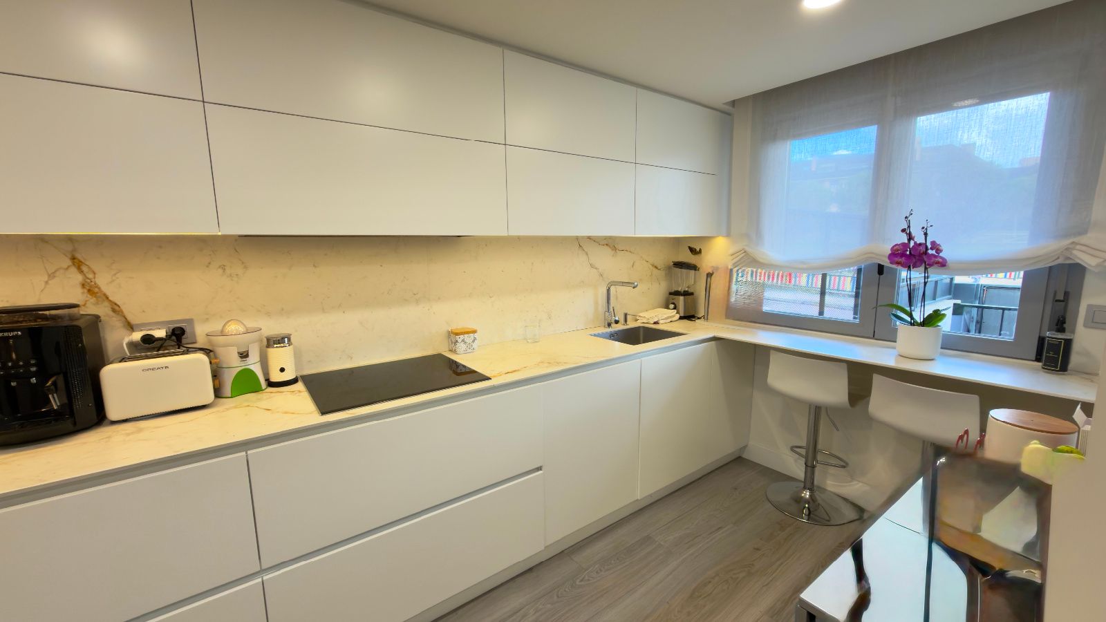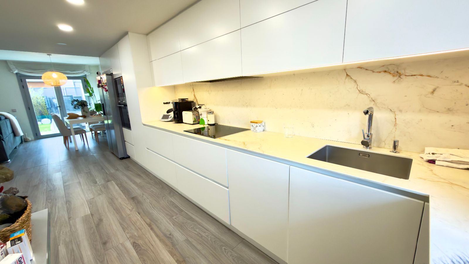 La cocina, integrada con el espacioso salón-comedor, constituye el corazón de la casa, inundado por la luz natural que entra a través de los amplios ventanales y con acceso directo al jardín, proporcionando un ambiente acogedor.