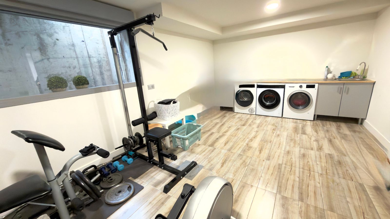 El sótano ofrece un espacio versátil, con una sala espaciosa iluminada por un patio inglés, perfecta para crear un ambiente de relax o incluso un gimnasio privado. Además, cuenta con una zona de lavandería y acceso directo al garaje subterráneo con capacidad para dos vehículos, garantizando comodidad y seguridad.
