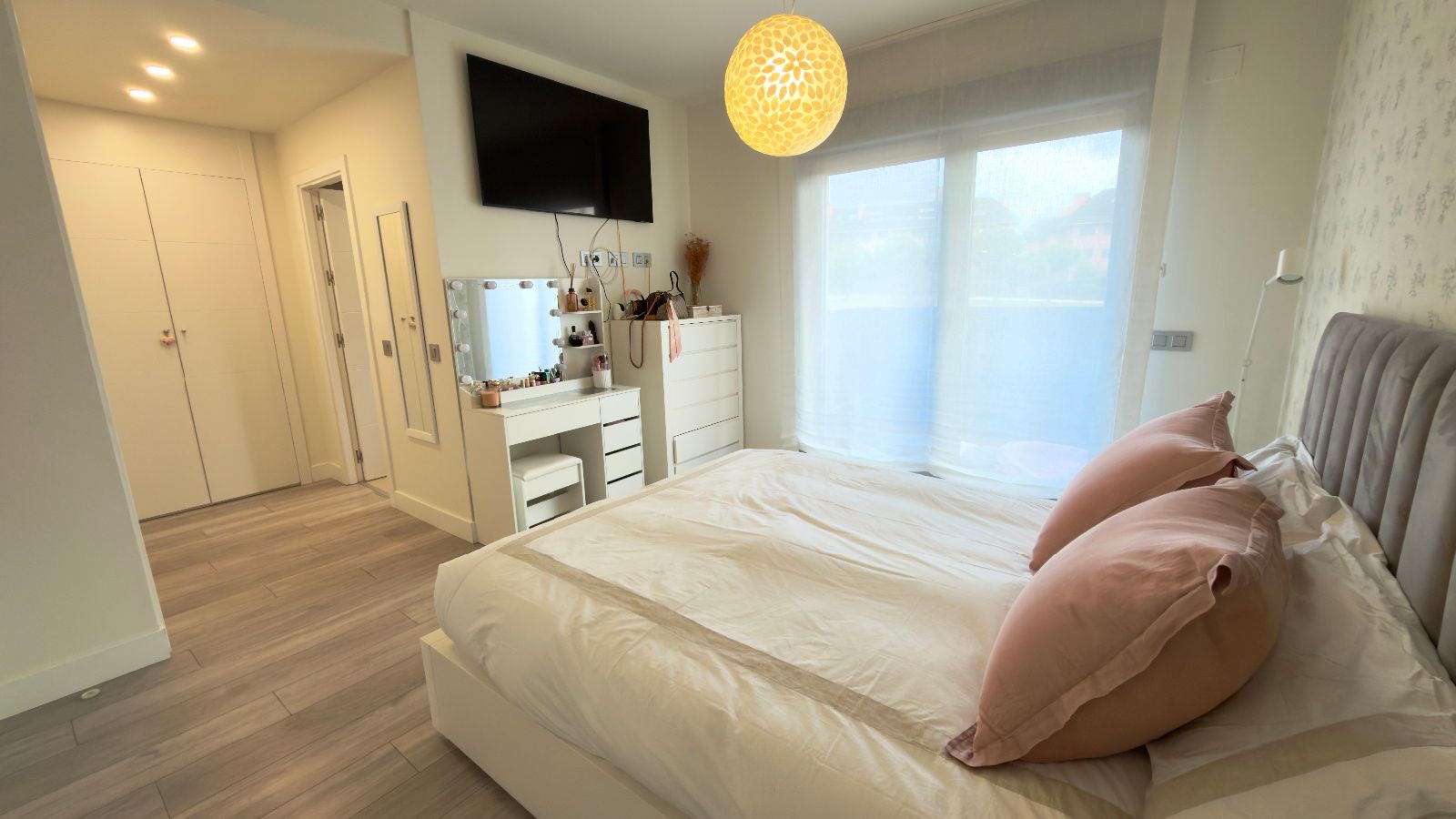 En la primera planta, dos habitaciones secundarias de buen tamaño comparten un baño completo con bañera, mientras que la habitación principal deslumbra con su zona de vestidor, un lujoso baño en suite y una espaciosa terraza que brinda vistas hacia la entrada de la vivienda, inundando el espacio con luz natural y creando un ambiente sereno y acogedor.
